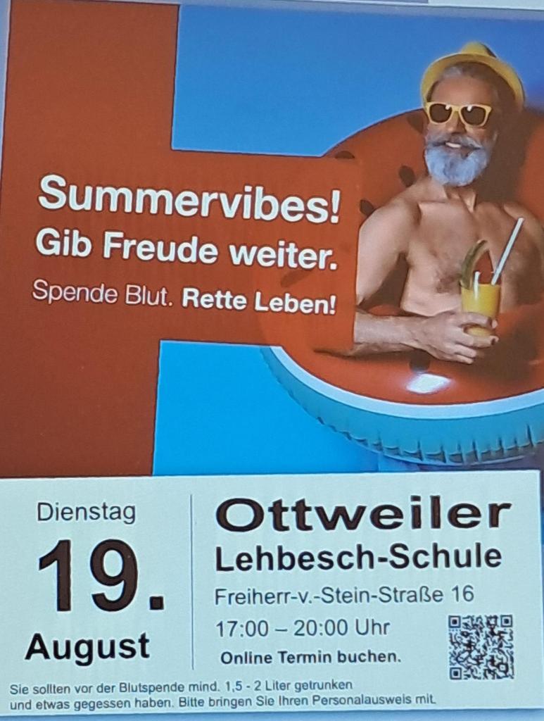 Bei dieser Blutspende werden wir, wie im letzten Jahr, Grillwürste, Käseweck, Kuchen und Obst anbieten. Kommen Sie vorbei und unterstützen Sie, besonders jetzt in der Urlaubszeit, die Blutspendenzentrale mit Ihrem Blut.