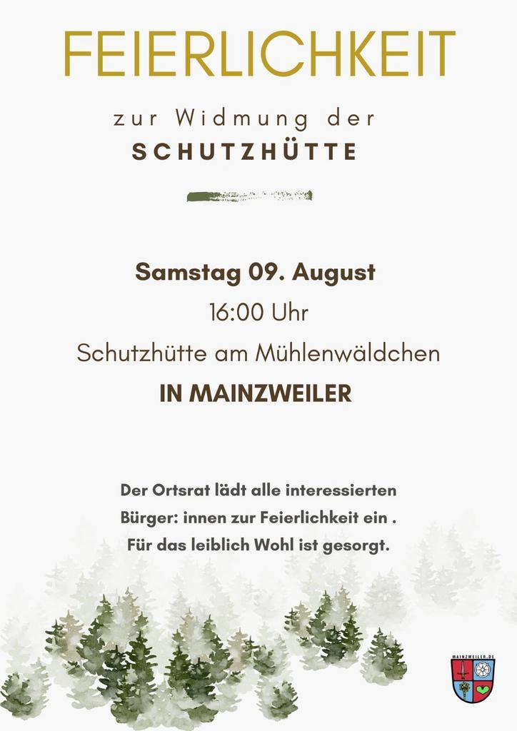 « Alle Veranstaltungen Diese Veranstaltung hat bereits stattgefunden. Widmung der Schutzhütte in Mainzweiler 9. August um 16:00 bis 19:00 Zum Kalender hinzufügen Google Kalender iCalendar Outlook 365 Outlook Live